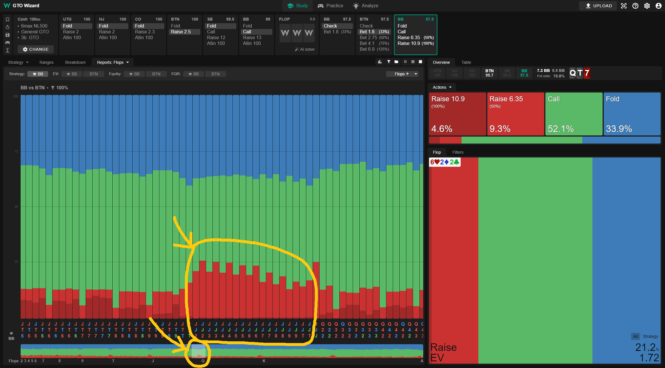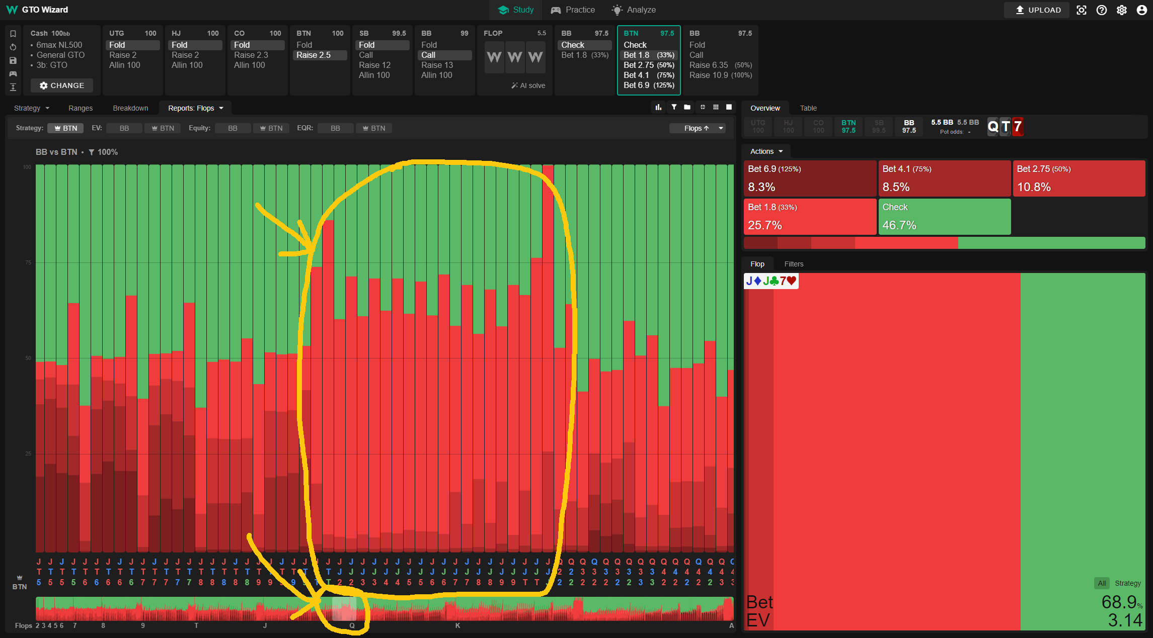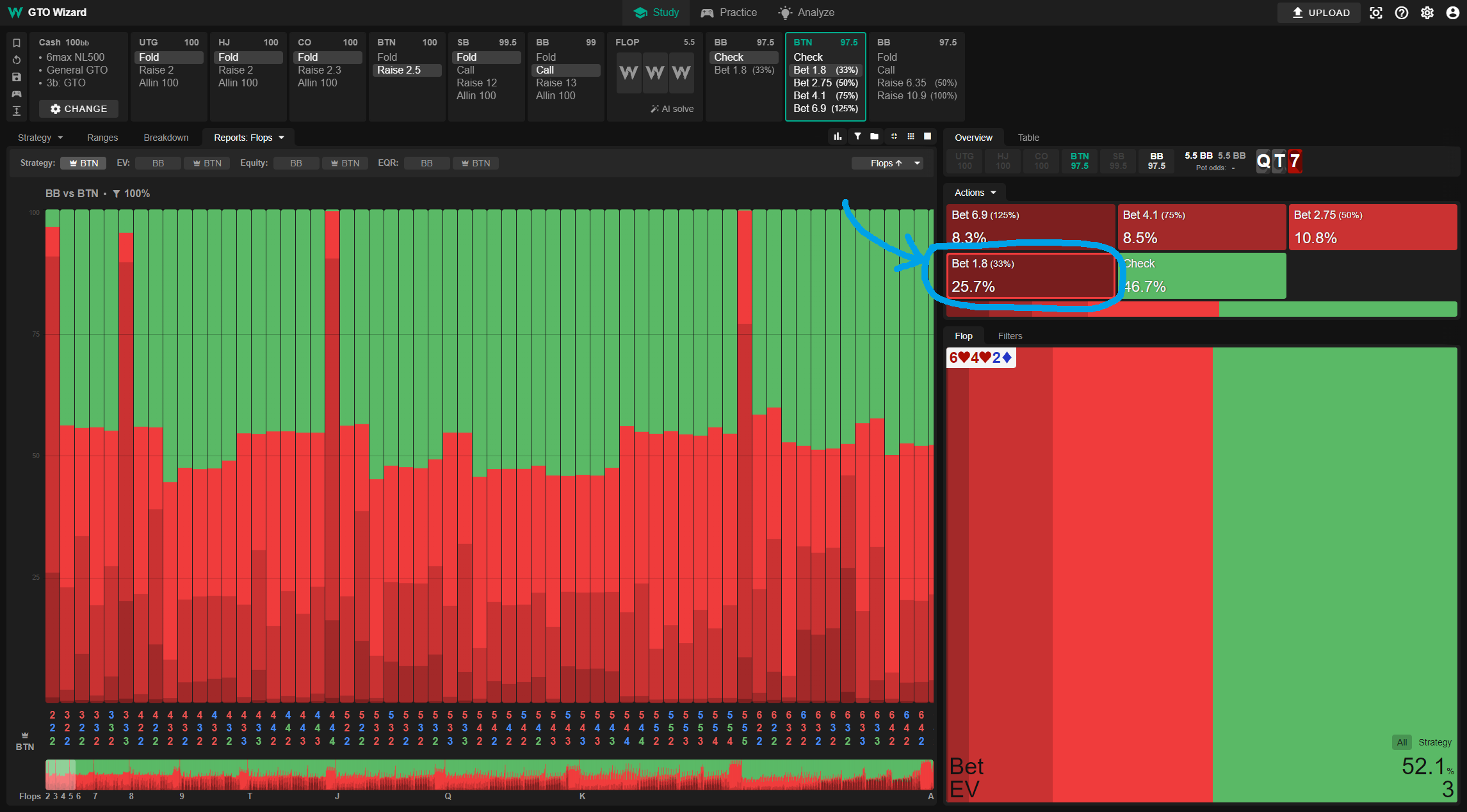 If we navigate to the Button, we see their overall distrubution of cbets over all 1755 flops. And we can see that the most used sizing overall is 33%. So let's select that and see how our reaction in the BB would look like.