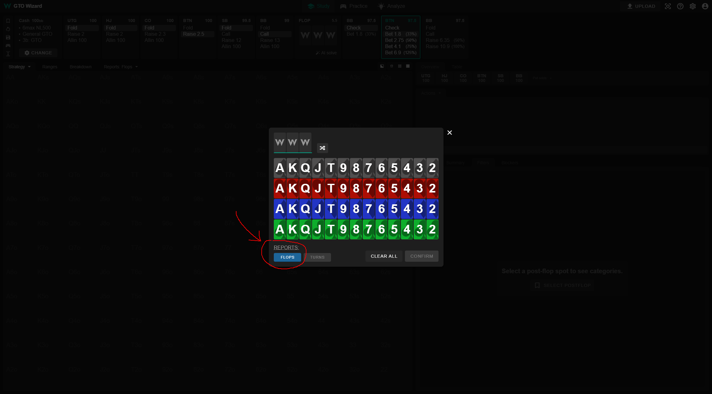 Now, we open GTO Wizard, navigate to the spot and use their awesome feature which is called Reports. With Reports, you can look at all 1755 strategically different flops and see the distribution of bets, raises, calls and folds among them.