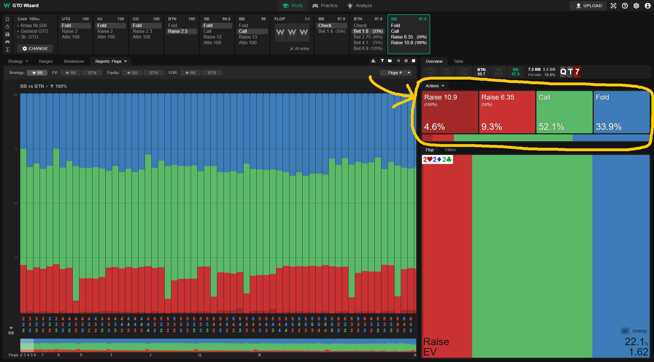 From these reports, we can also see how often different sizes are picked. Here, the choices are check-raising 50% pot or 100% pot. And the smaller sizing, 50% pot, is used almost exactly twice as often as the bigger sizing.