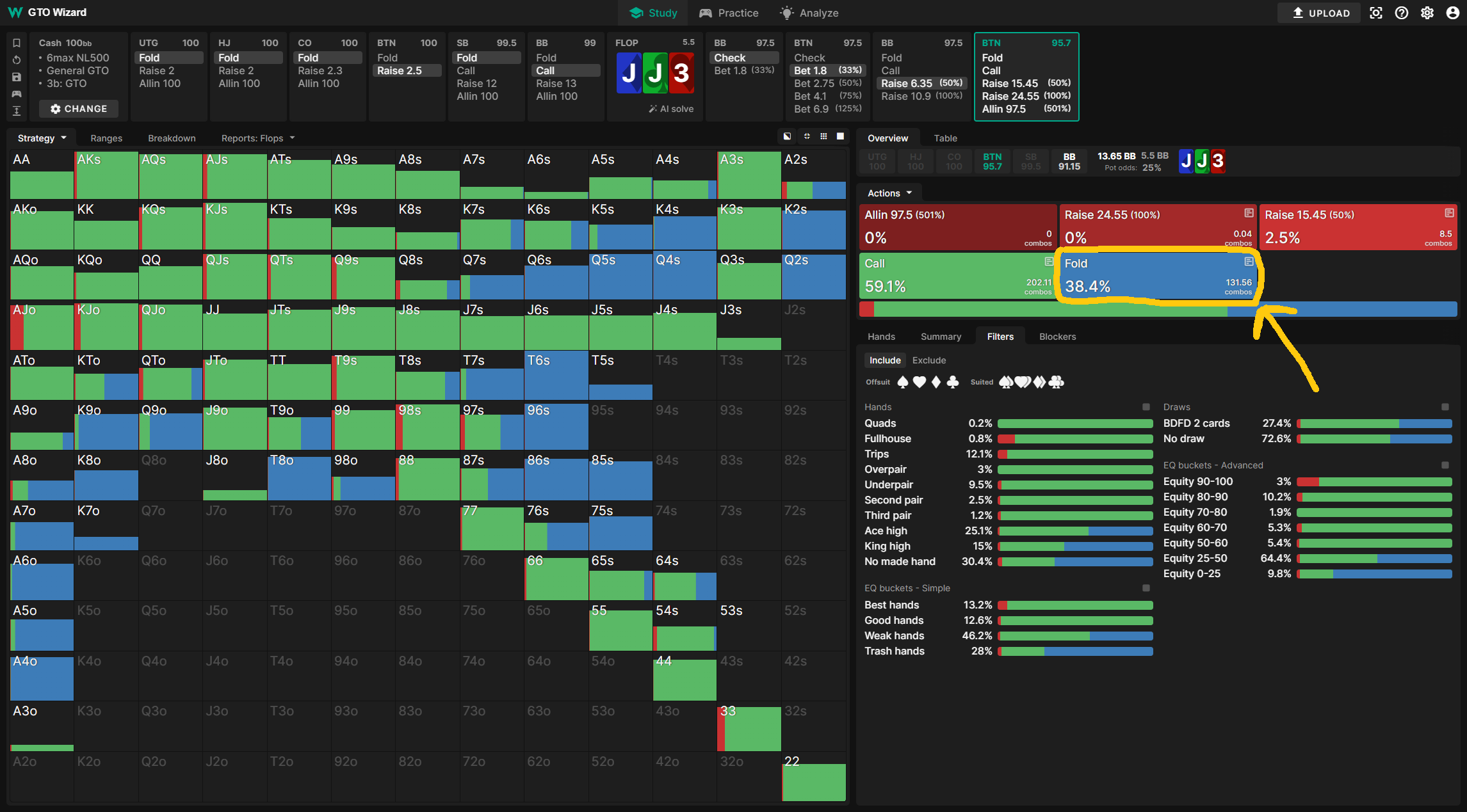 On the same JJ3r flop, the BTN would have to fold 38% against a check-raise, so a big portion of their range. Which makes check raising attractive for the BB.