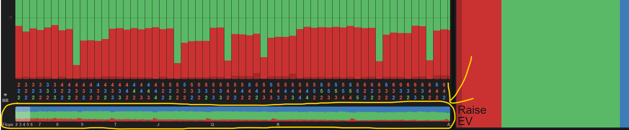 To make up for this, they want to check-raise a lot: almost 25% of hands would be good enough to check-raise. A lot of them would of course be trips. And they are accompanied by small pocket pairs which profit from denying equity to higher overcards.
