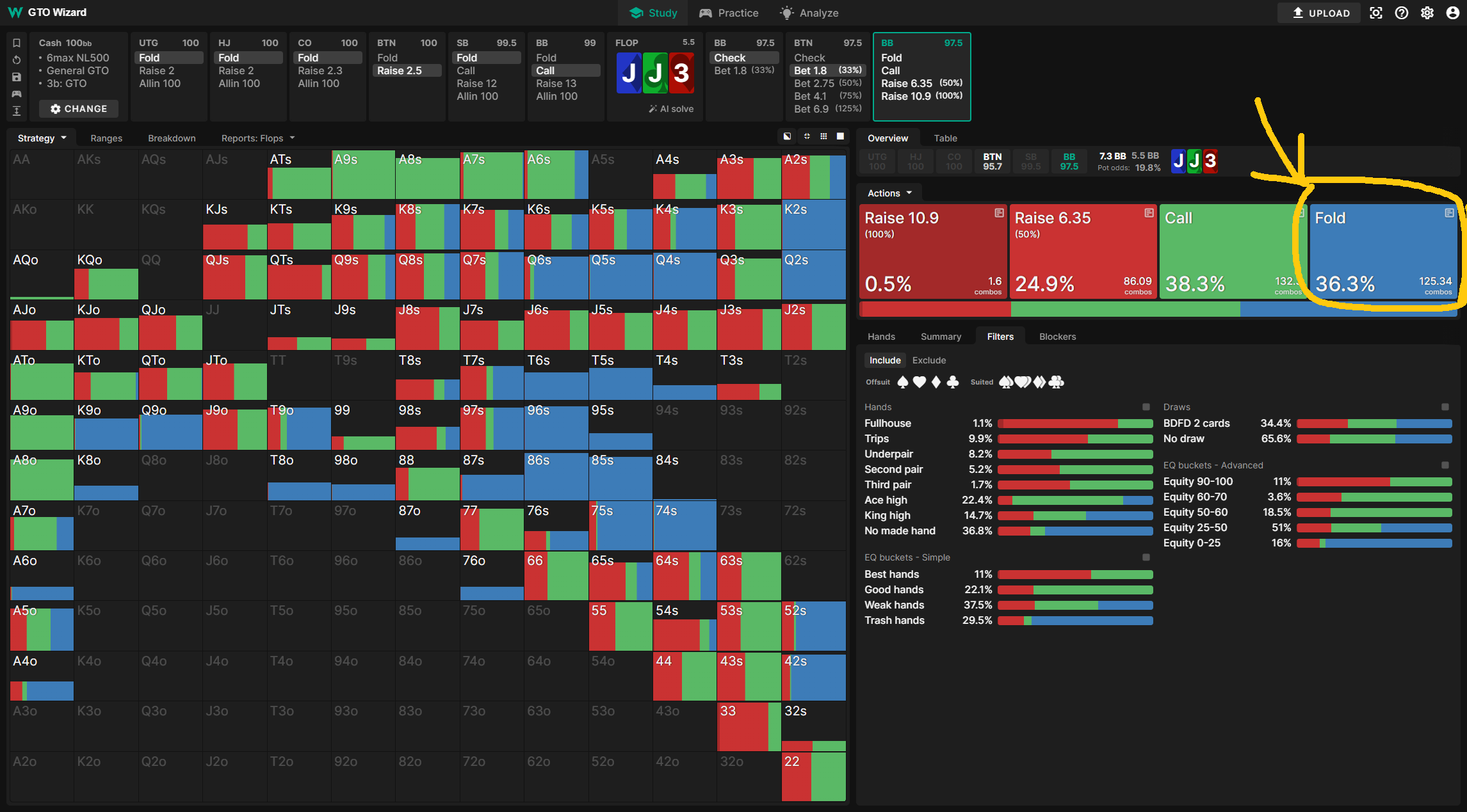 At the same time, the BB can expect a lot of folds when they check-raise the BTN cbet. Why? Because of the same reason as before: the BTN's cbetting range is wide and will therefore include a buch of hands that cannot continue against a check-raise. And by check-raising, the BB takes down the pot immediately and prevents them from realizing their equity with these hands.